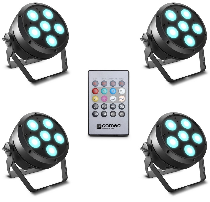 Root Par Set består af fire Cameo ROOT Par 4 spotlys. Hver med 7x4W RGBW LED. Dette sæt leveres med en praktisk IR-fjernbetjening., Så du nemt kan styre lysene fra afstand.